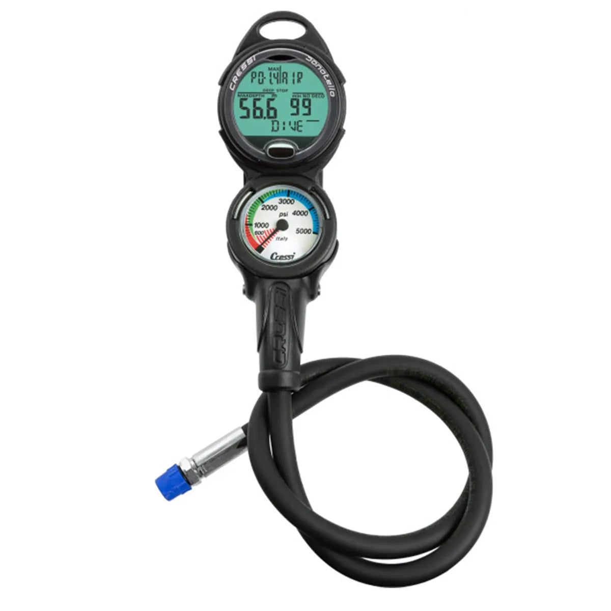 The Cressi Mini Global Pressure Gauge has a luminescent dial that reads from 0 to 5000 psi (0 to 350 bars). Gauge is ready to travel the world w/you w/both imperial & metric gauge readouts. A true world travel instrument, high-quality instrument, built w/a chrome plated brass case. Gauge face is divided into different colored zones for at-a-glance monitoring of air: From 0 to 600 psi (0 to 50 bars) is highlighted in red w/solid bar & red stripes. Large circular easy-to-read scale. Pressure gauge comes w/a 7/16" high-pressure hose. Instruments are housed in a small, console boot, made of Polycarbonate & Desmopan, (thermoplastic polyurethane) 2-materials that guarantee protection from shocks, scratches & which, at the same time, is very light. The entire 2-guage console boot comes w/multiple attachment points for clips or lanyards.
